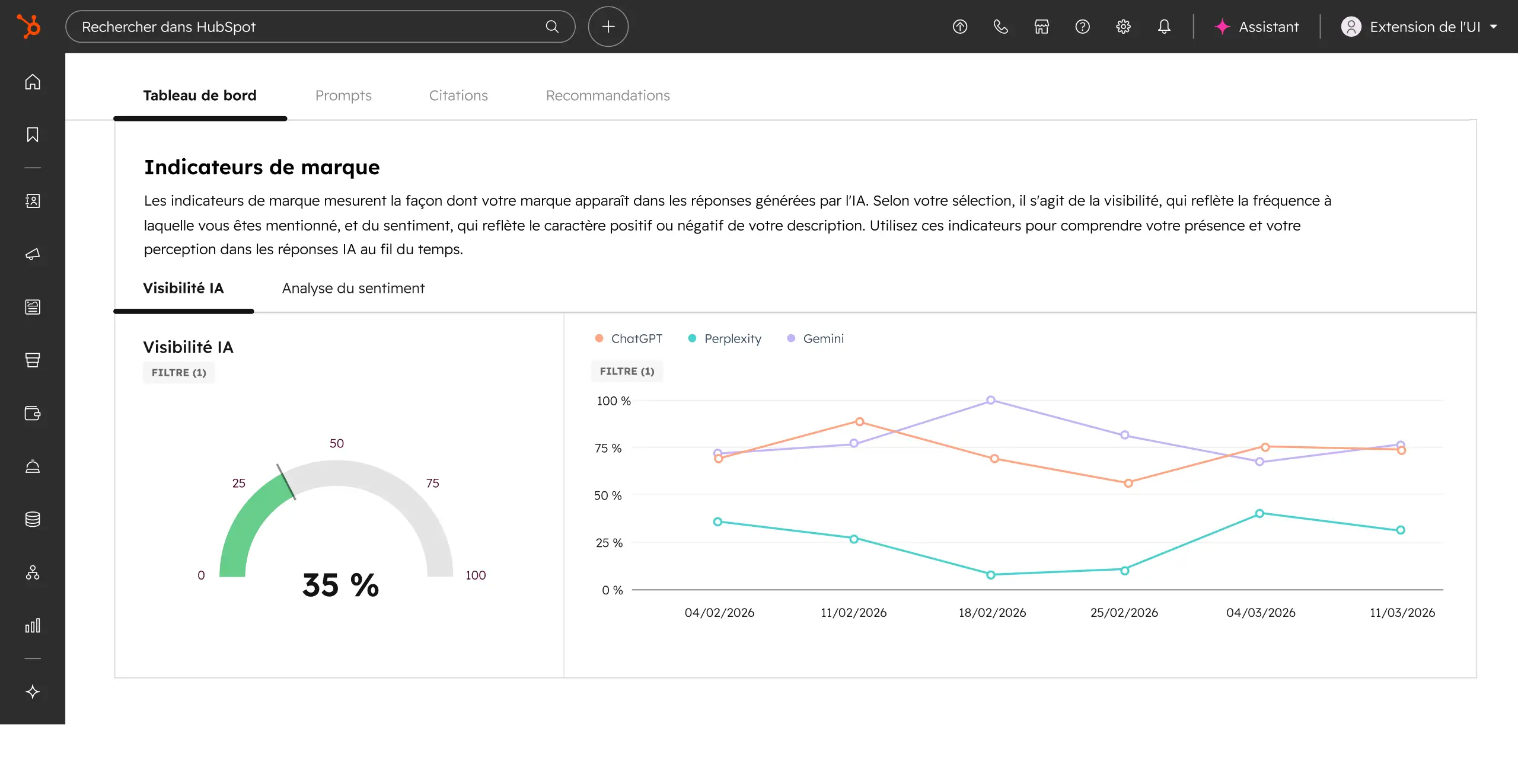 HubSpot AEO vous permet de suivre des KPIs tels que votre visibilité IA, votre part de voix ou encore votre taux de citation par canal. Cela vous permet de mesurer votre performance et repérer les points sur lesquels travailler en priorité pour être cité davantage par les moteurs IA.