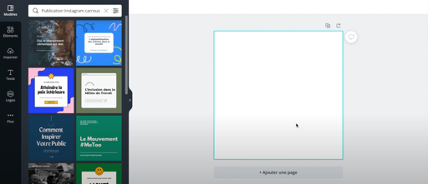 Ainsi, pour commencer la création d'un carrousel Instagram, il suffit au créateur de sélectionner « Publication Instagram Carrousel » dans la liste des formats proposés par Canva. Par défaut, un espace de création d'une dimension de 1080 x 1080 pixels s'affiche. À gauche de l'interface de conception, Canva affiche des modèles pré-conçus pour aider le créateur dans la mise en forme de son carrousel, mais il est également possible de mettre en forme le carrousel en partant d'une page blanche.