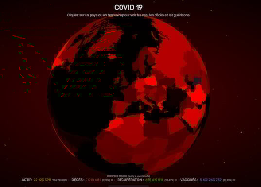 Le covidvisualizer permet de suivre les chiffres de la covid 19 à travers le monde. Cette représentation dynamique du globe terrestre illustre une diffusion large de données mondiales. La data collectée et analysée pour réaliser cette carte est colossale et éparpillée sur différents territoires. Les nuances de rouge qui recouvrent la mappemonde s'éclaircissent au fur et à mesure que le nombre de cas diminue. Une légende claire et minimaliste permet de comprendre rapidement les données affichées. De plus, le public a accès aux informations sous forme de graphiques en cercle qui identifient clairement les décès, cas actifs et guérisons répertoriés pour chaque territoire.