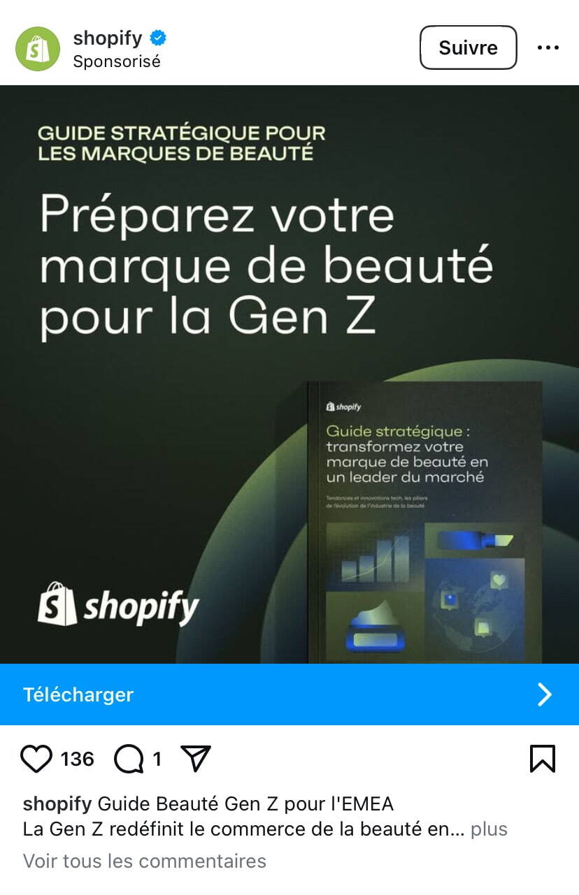 Shopify déploie des campagnes publicitaires sur les réseaux sociaux, ici sur Instagram. Le CTA de téléchargement de contenu premium dirige vers une page de formulaire, où l'entreprise collecte les données des prospects en phase de considération.