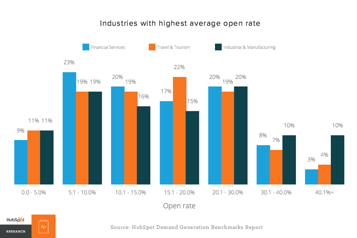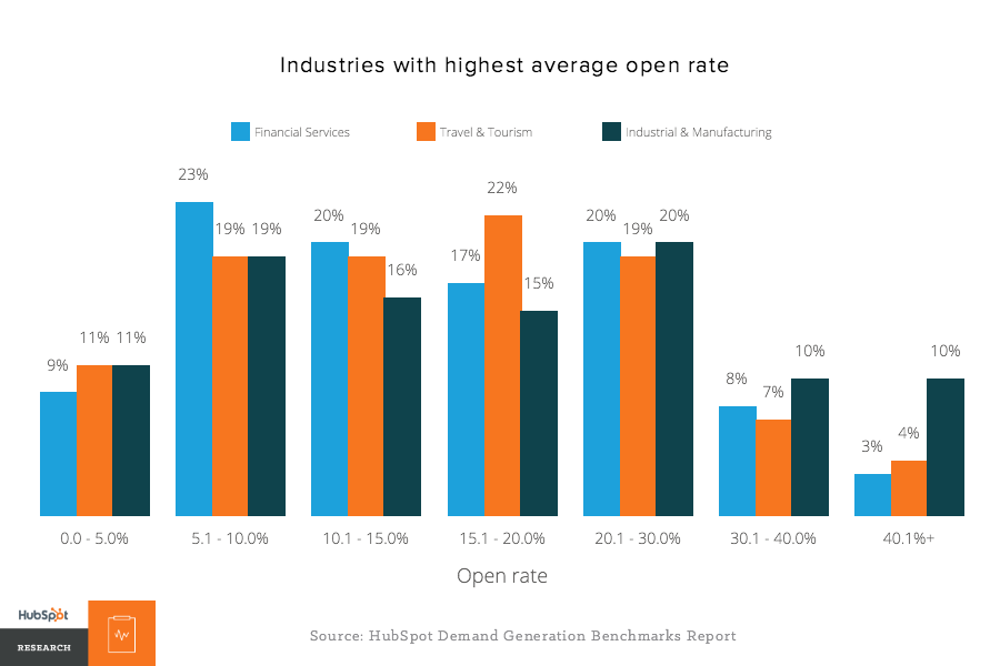 De fait, Nile constate chez ses clients industriels des taux d'ouverture sur les e-mails à faire pâlir d'envie la plupart des marketeurs. Ceci est confirmé à plus grande échelle par le rapport de HubSpot.