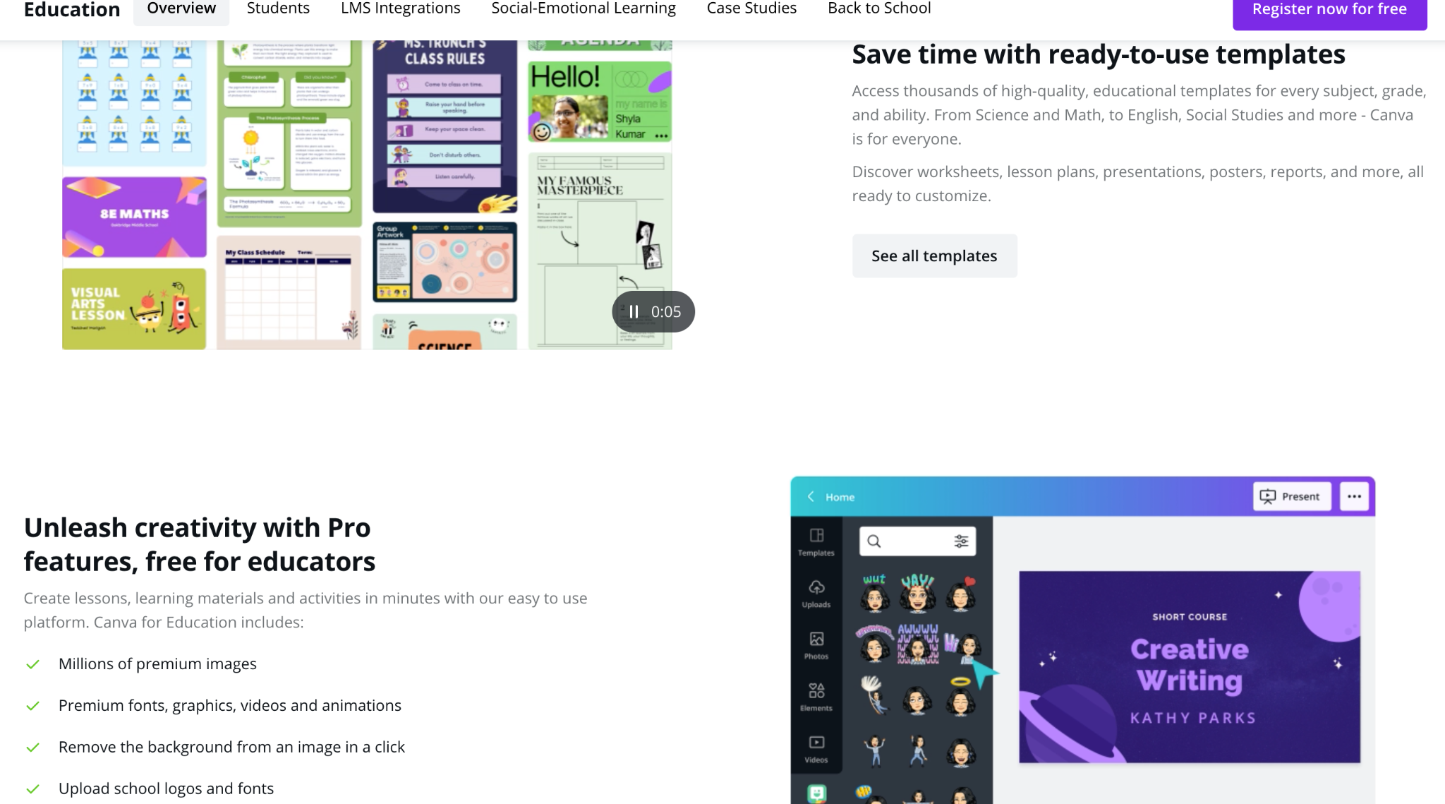 Deuxième stratégie de Canva pour offrir du contenu éducatif gratuit : cibler deux catégories sociales représentant une grande partie de la base d'utilisateurs de la plateforme, les enseignants et les étudiants. Canva for Education offre ainsi des comptes Canva Pro gratuits aux enseignants de la maternelle au lycée pour qu'ils puissent configurer leur espace de cours, inviter des élèves et créer des supports visuels. Comme expliqué plus haut, ces actes de philanthropie permettent d'inscrire les valeurs de l'entreprise dans l'imaginaire collectif tout en générant une communication très positive autour de la plateforme.